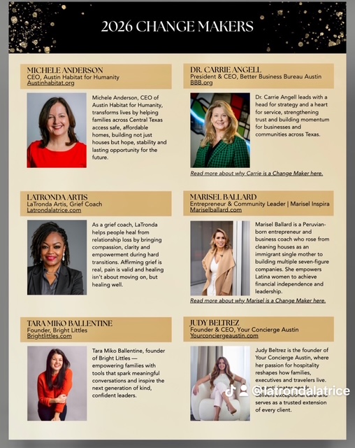 December 2025, l learned that I was an Austin Woman 2026 Change Maker nominee, and January 2026, that I was named an Austin Woman 2026 Change Maker.